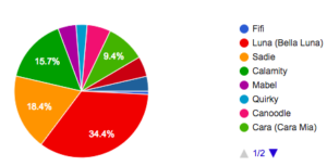 When I asked you to name Rae Di Luca’s new dog, 2019 of you voted, and a lot of you sent even more suggestions. Thank you to everyone! The overwhelming winner with 35.2% was…Luna! For Rae, who loves her, I’m sure her name will always be Bella Luna. When you help with the important tidbits of writing the Cape Charade series, it makes my job easier.